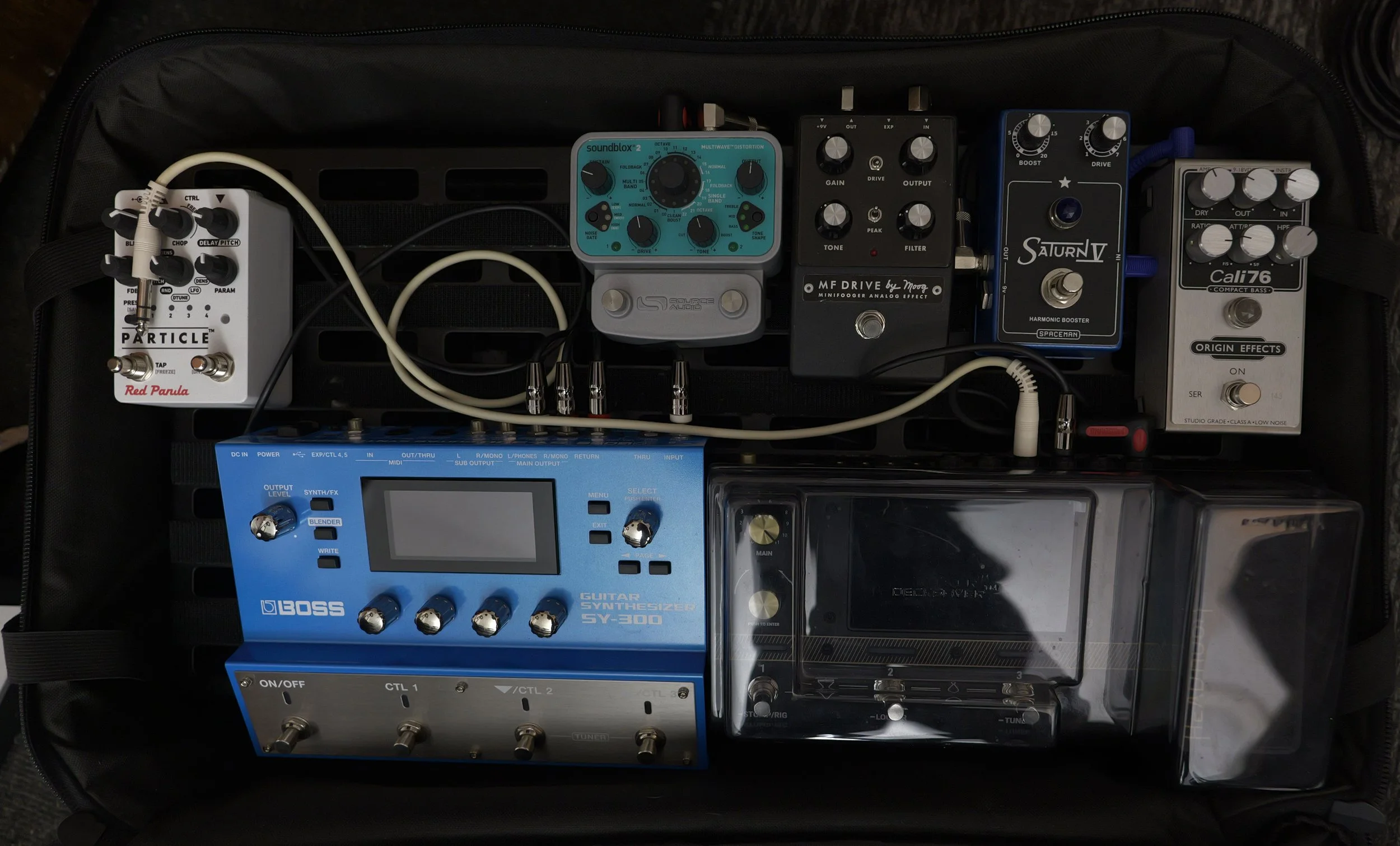 Custom Strat, 3 x Casio PG, Headrush modeller, 300W Power Amp, 1x12 Cabinet with Celestion Cream speaker, pedalboard with all kinds of exciting things.