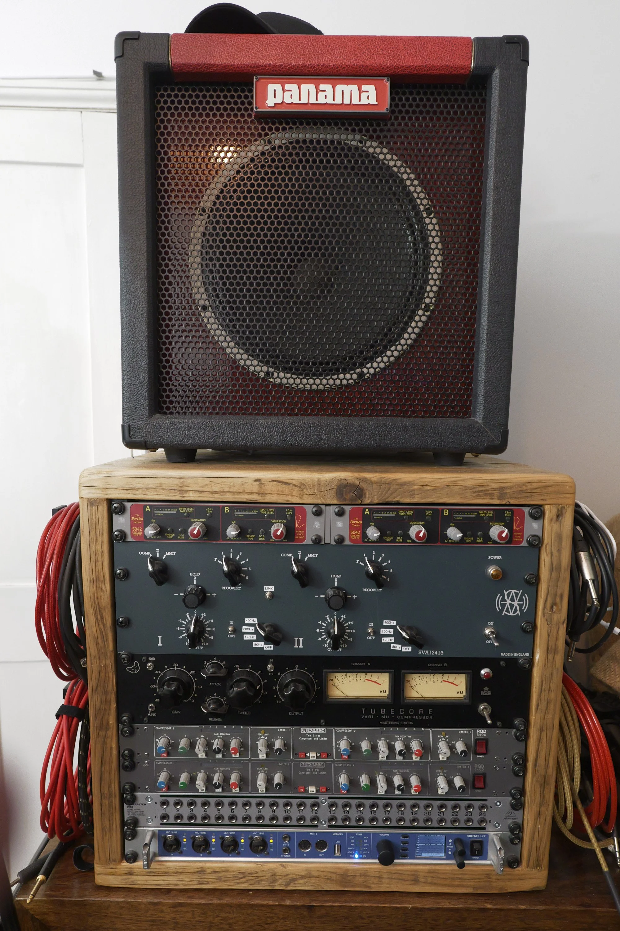 Abbey Road EMI TG12413 Clone, Chandler TG Opto, IGS Audio Tubecore Mastering Edition, 2x Portico 5042 Tape Emulators, 2x Calrec RQD 6400 twin stereo compressors, Benchmark 16-channel preamp, lots more strange bits and bobs...